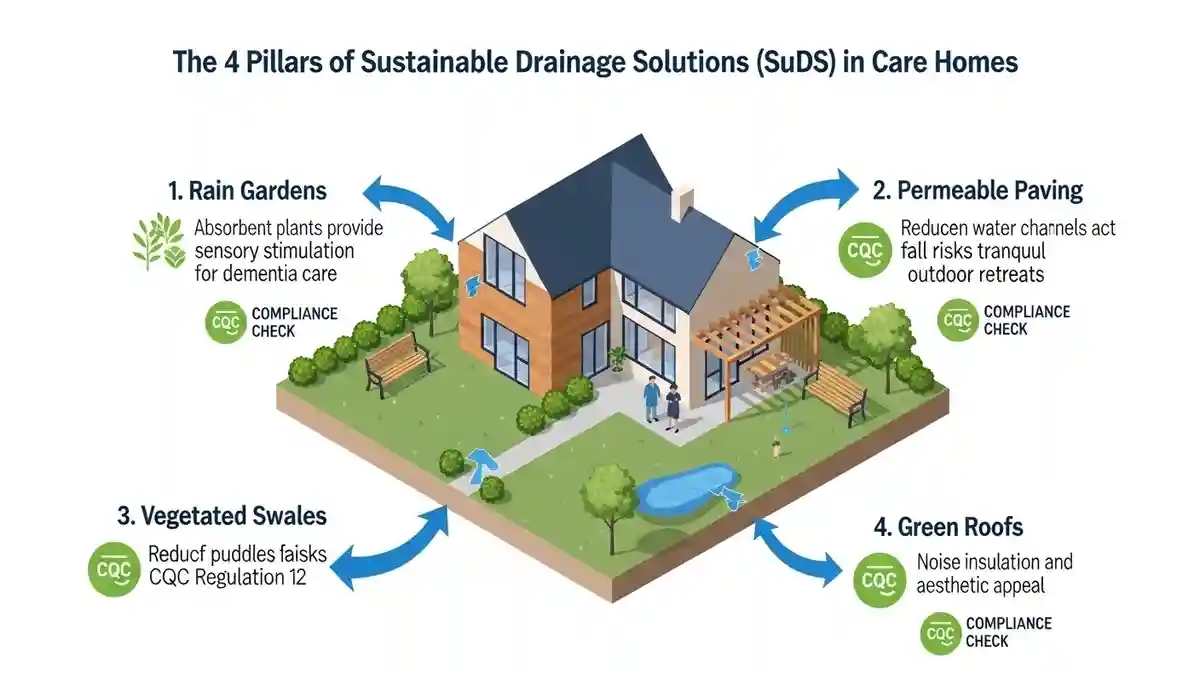 The future of sustainable drainage solutions CQC care home design is the integration of SuDS (Sustainable Drainage Systems). In Denham, Policy EN18 of the Local Plan encourages SuDS to manage surface water runoff, which often plagues the surrounding area.